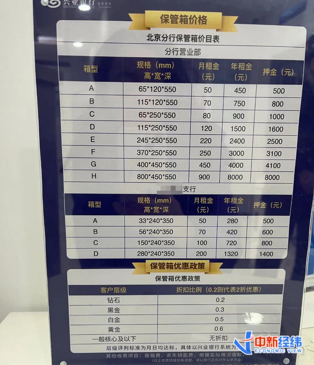 兴业银行某支行展示的保管箱价目表显示,该行分行营业部的保管箱分为A到H八种箱型,最小的A型年租金450元,押金500元;最大的H型年租金8000元,押金8000元。钻石、黑金、白金、黄金客户分别可以打2折、3折、5折、6折。